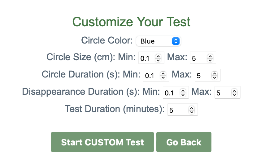 The customized saccade eye test/exercise is accessible online and costs $10. The variables that will be customizable include: circle color, duration of target appearance, duration of target disappearance, and test duration. All of these variables can be randomized as well. The image shown to the right is what the form will look like to setup the test.