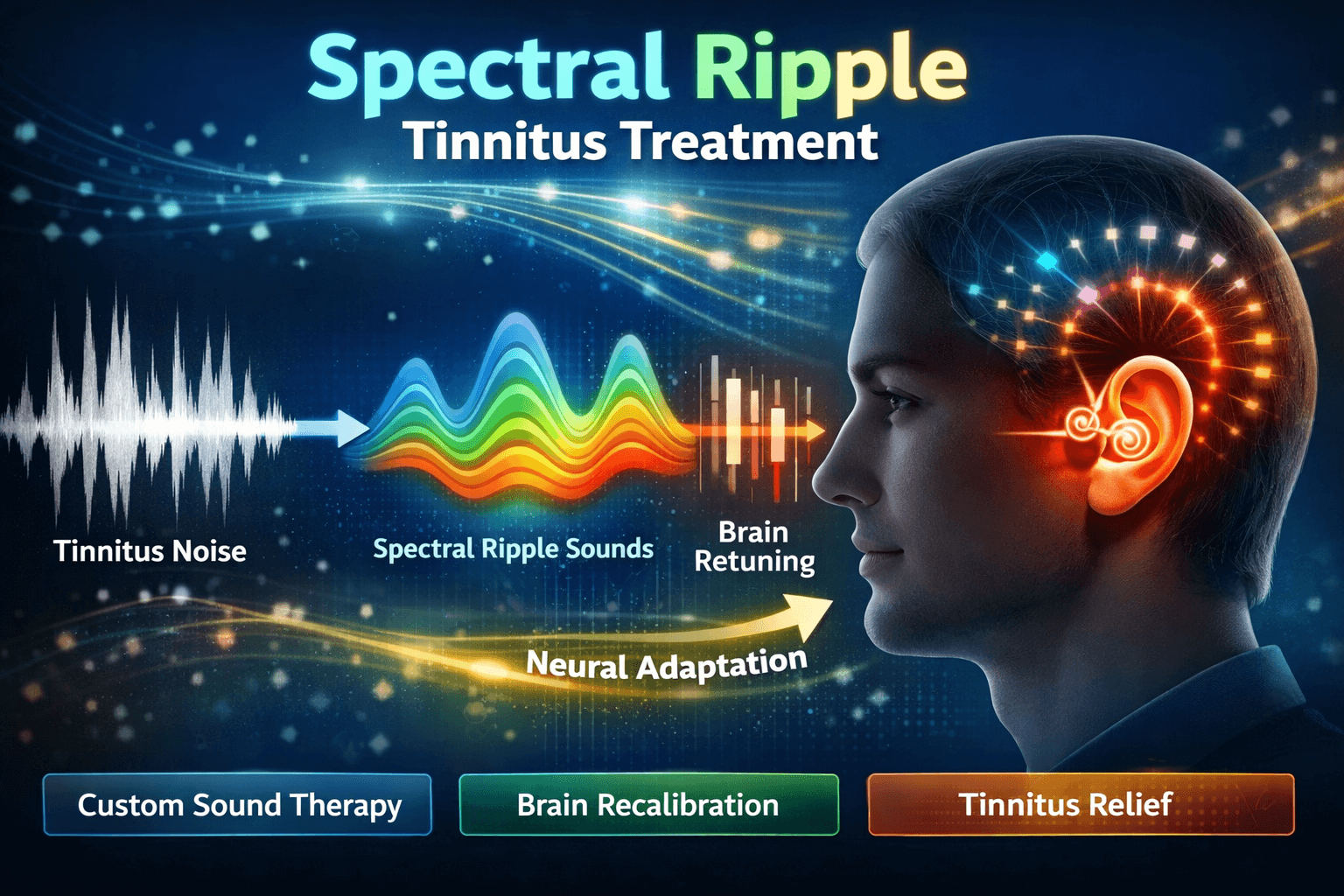 Spectral ripple sound therapy (aka cross-frequency de-correlating stimulus modulation) is a new type of sound designed by researchers in 2025 to break up this over-synchronization. The goal was to make the brain’s activity at tinnitus-related pitches less tightly linked, which could make the tinnitus seem quieter.